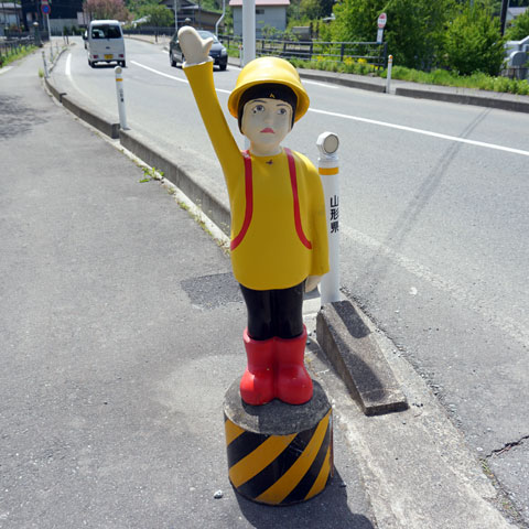 あと5分くらいで学校に到着するときに、通学路なので、交通安全、歩行者優先などの看板がありますが、ひと際目を引く人形が視界に入りました。交差点でよく見る、右手を挙げた人形です。
